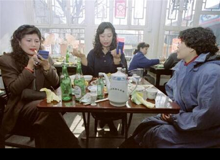 1994年2月25日,北京,婦女在飯店用餐后補(bǔ)妝?!跋吗^子”和“紅嘴唇”是當(dāng)時人們對經(jīng)濟(jì)寬裕與化妝的理解。