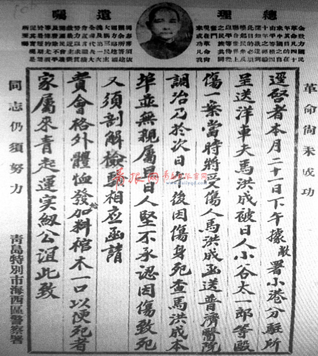 警察趕赴現(xiàn)場,將馬洪成救出并送到附近的一家日本診所,日本醫(yī)生竟說“無妨”,不予治療。無奈,警察又將馬洪成送往普濟醫(yī)院(今青島市立醫(yī)院),因傷勢過重,又延誤搶救時間,22日上午11時死亡。馬洪成家在外地,但具體何處,現(xiàn)存史料無明確記載。鑒于此,23日,青島特別市海西區(qū)警察署致函青島總商會,“請發(fā)給馬洪成加料棺木一口”。