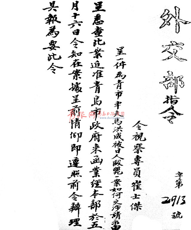 ?同年5月16日,在青島市政府申請爭取下,國民政府外交部下達訓(xùn)令,授命視察專員崔士杰處理此案。