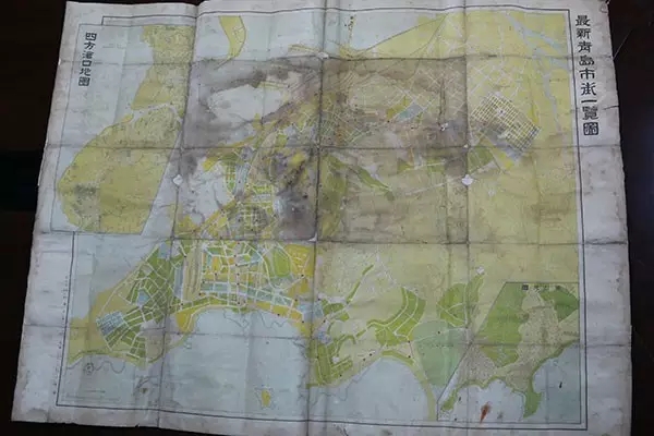 該地圖的大題頭為《最新青島市街一覽圖》,縮尺:六千七百五十分之一,左上右下角為小題頭,分別是“四方滄口地圖”、“湛山地圖”、縮尺:二萬六千分之一。發(fā)行元(者):青島山東路“博文堂”(今高密路西向末端即是):印刷:大阪市天王寺區(qū)大道壹丁目五十番地“十字屋”(甚為遺憾,地圖末注出版、印刷年代和日期)。