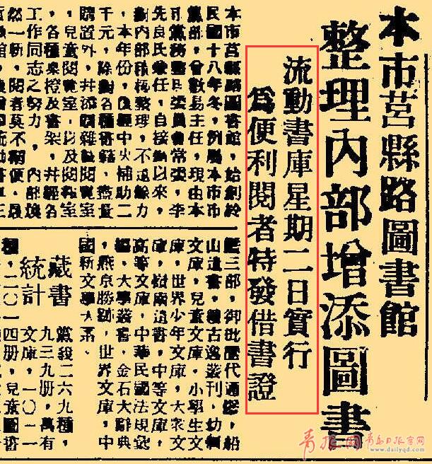 青島市圖書館的管理者為提高館藏的利用率,迎合廣大讀者的文化閱讀需求,積極推出各種便于市民讀者借閱的舉措。 1935年6月,為向廣大讀者提供借閱便利服務(wù)和“推廣圖書效用”,青島市圖書館設(shè)計(jì)制做流動書車3輛。
