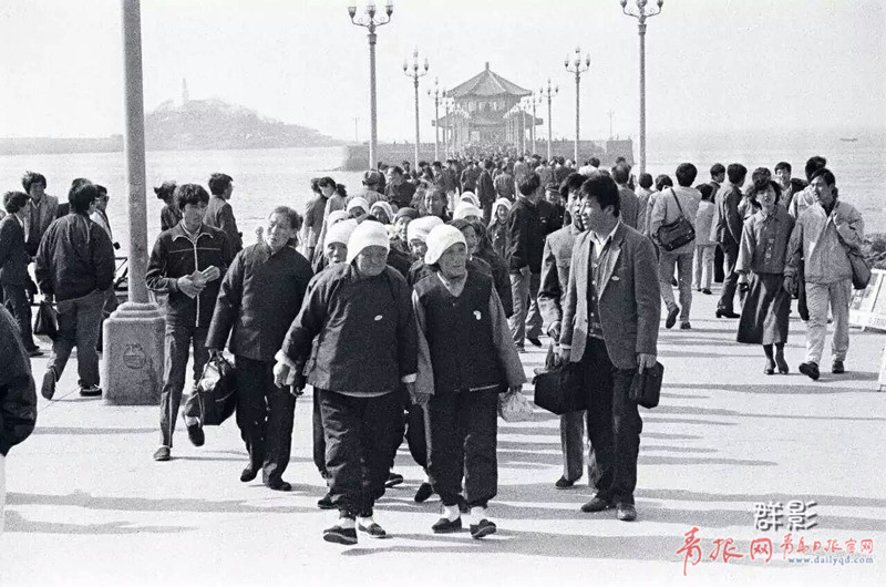 1990年5月1日,一批來自淄博常家莊的農(nóng)村婦女在棧橋游覽,其中年齡最大的81歲。(青島日報/青報網(wǎng)記者 王群 攝)