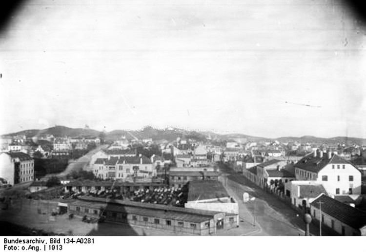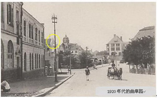 這張照片(圖2)標(biāo)注也是攝于1900年,對(duì)比圖1和圖2這兩張照片,可以發(fā)現(xiàn)它們是一個(gè)地方,只是拍攝的角度不一樣。但從圖2可以看出一個(gè)明顯的方位,就是照片的后景為現(xiàn)在湖北路和新泰路交口的青島市公安局塔樓。從資料看,青島市公安局在德占青島時(shí)稱膠澳警察署,建于1904年,由此而見,圖2這張照片不是攝于1900年。但從這張照片完全可以判斷出它位于現(xiàn)在的湖北路與新泰路口,前不久發(fā)現(xiàn)的一張老照片也印證了這一點(diǎn)——?