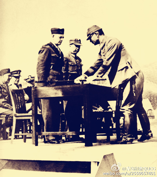 日軍投降代表第五獨(dú)立混成旅團(tuán)長(zhǎng)長(zhǎng)野榮二少將呈獻(xiàn)戰(zhàn)刀