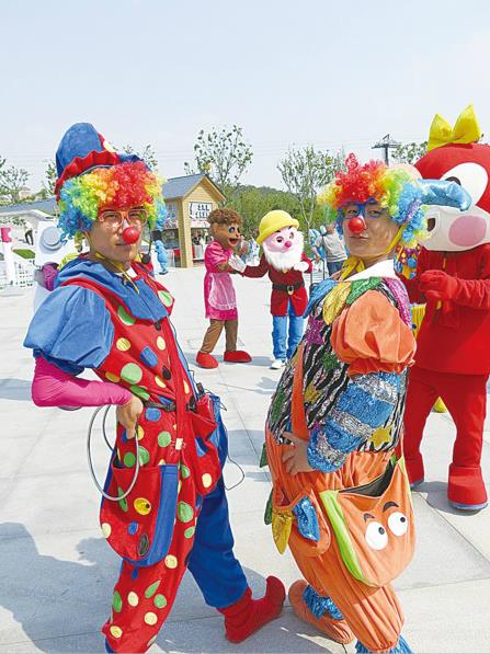 張宇(左)與同事扮的小丑相互配合 劉岱 攝