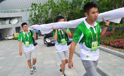 迎著清晨的第一縷陽光,在滿園的五彩繽紛中,來自國際競賽組委辦的小花豆——喻天洋、張金磊、常云飛早早來到花藝園。他們主要協(xié)助布展人員進行花卉競賽前布置。為做好賽前工作,他們搬運物品、擺放花卉等等,不怕臟不怕累,充滿熱情,看似簡單的事情,讓他們用青春渲染得絢麗多彩。小花豆們興奮地說:“志愿服務(wù),沒有最好,只有更好。”