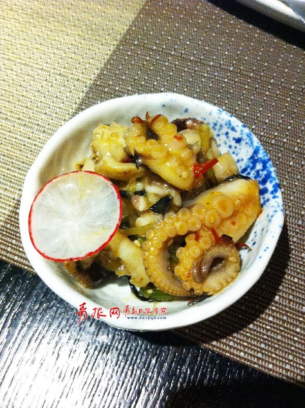 首先上來(lái)的開(kāi)胃小菜,新鮮小章魚(yú)搭配了爽口的綠色海菜。小章魚(yú)經(jīng)過(guò)腌制冷凍處理,口感又脆又嫩。只是分量有點(diǎn)少哦,小小一盤(pán)小編感覺(jué)不過(guò)癮呢。