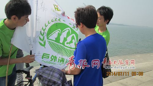 騎行途中,隊(duì)員們?cè)谟龅饺巳壕奂牡胤竭€會(huì)停下來(lái)向大家宣揚(yáng)低碳生活與環(huán)保理念,面對(duì)黃島市民的疑問,隊(duì)員們都耐心作答。不少青島市民還在隊(duì)員攜帶的旗子上簽名表示對(duì)踐行低碳生活的承諾。