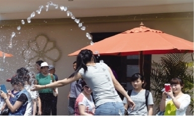 ????2014青島世園會(huì)將要經(jīng)歷春、夏、秋三個(gè)季節(jié),而目前正處于最炎熱的夏季,不斷攀升的氣溫沒能阻擋游客熱情的腳步。在漫步園中觀賞美景的同時(shí),游客們也紛紛亮出自己的“拿手絕活”來避暑:一手撐傘照相不方便?來一頂小傘帽不懼驕陽;游園暴走口干舌燥?一個(gè)大大的冰激凌讓你神清氣爽;悶熱出汗渾身難受?噴泉戲水樂在其中……除了游客自身的“高招”,會(huì)當(dāng)然也準(zhǔn)備了充分的降溫納涼措施:遍布園中的噴霧降溫讓人仿佛置身仙境,隨處可見的直飲水設(shè)施為游客帶來方便,舞臺(tái)周邊的遮陽傘不僅可供休息還能觀看演出……