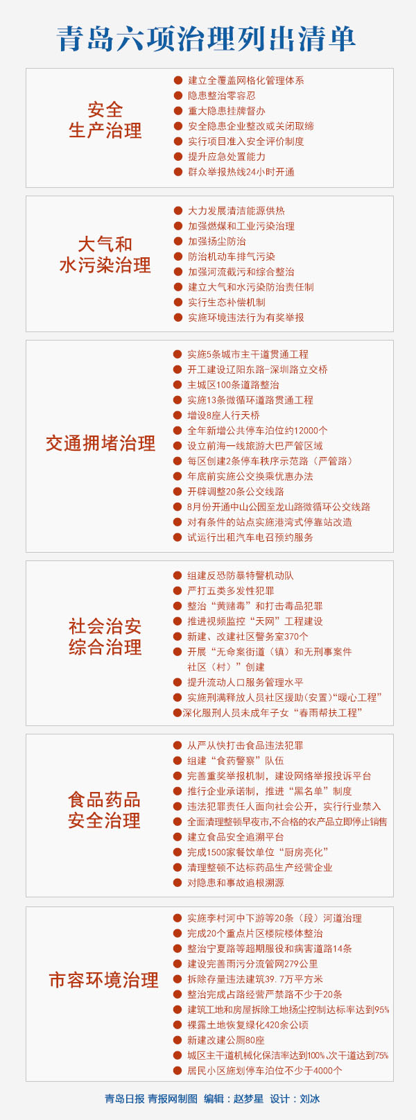 ??? 為全面完成2014年《政府工作報告》提出的各項工作任務(wù),重點抓好安全生產(chǎn)、食品藥品安全、大氣和水污染、交通擁堵、市容環(huán)境、社會治安等六大領(lǐng)域?qū)m椫卫砉ぷ鳎鄭u市政府于7月3日召開六大領(lǐng)域?qū)m椫卫砉ぷ鲃訂T大會。目前,全市已建立了六項治理總指揮部和六個指揮分部,形成了定期調(diào)度和監(jiān)督評價等六項工作機制。