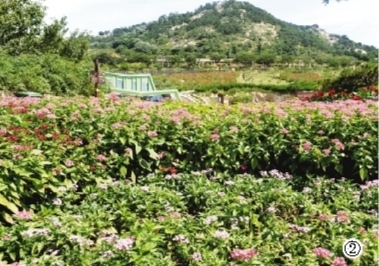 ②山坡上郁郁蔥蔥的綠色植被與山腳下花團錦簇的組擺花相映成趣。
