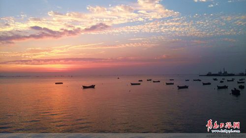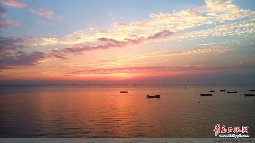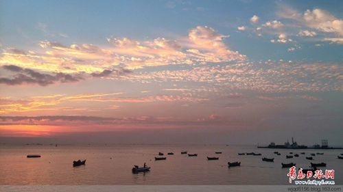 前幾天開車路過環(huán)灣大道島城后海附近時,適逢落日余暉,于是停車用手機隨拍了幾張照片,海面上正??苛巳齼蓛傻男〈嬗悬c漁歌唱晚的意味了。