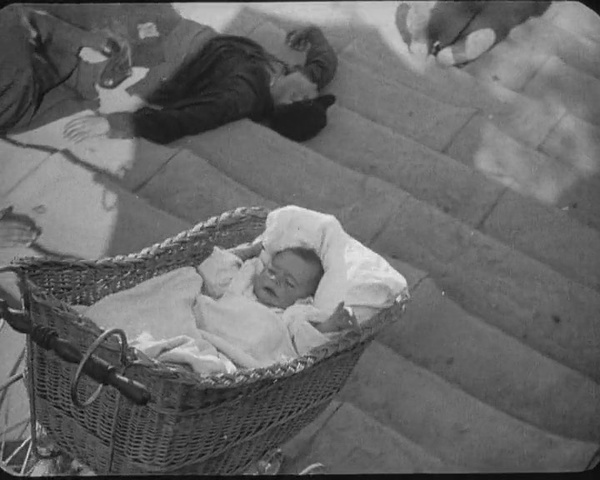 這部默片經(jīng)典作品是電影史上劃時(shí)代的巨獻(xiàn),最能表現(xiàn)前蘇聯(lián)電影大師謝爾蓋·愛森斯坦的蒙太奇藝術(shù)精義。內(nèi)容描述在1905年發(fā)生于波坦金號戰(zhàn)艦上的一次嘩變,該艦原是帝俄海軍的驕傲,但一連數(shù)月伙食太差,肉都長滿了蛆,水兵因抱怨伙食而遭軍官擊斃,由此引發(fā)叛變。軍艦開到奧德薩石階接受人民的食物補(bǔ)給,但步兵趕到鎮(zhèn)壓,發(fā)生了階梯上的大屠殺。這段高潮是影史上最著名的場面之一,鏡頭剪接精準(zhǔn),母親眼看嬰兒車滾下石階的一段尤為代表作。后《鐵面無私》的火車站槍戰(zhàn)場面就是模仿本段而來。