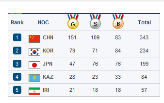 ????東道主韓國隊不出人意料的獲得了第二名,獲得了79金71銀和84銅,這也是自98年曼谷亞運會以來,韓國隊連續(xù)5屆蟬聯(lián)金牌榜和獎牌榜的第二位,而79塊金牌則是韓國參加亞運會以來拿到最多的一次。其中分量最終的當屬男足金牌,這也是韓國最后一次施行一枚亞運金牌就可以免服兵役,所有球員都有登場紀錄,其次,韓國男女籃和女排也登上了亞運會的最高領獎臺,三大球的6塊金牌,韓國收獲了其中的4枚。不過這79金中,韓國在游泳和田徑兩大項中1枚金牌都沒有獲得,射擊等傳統(tǒng)強項和上屆相比也有著不小的滑坡。