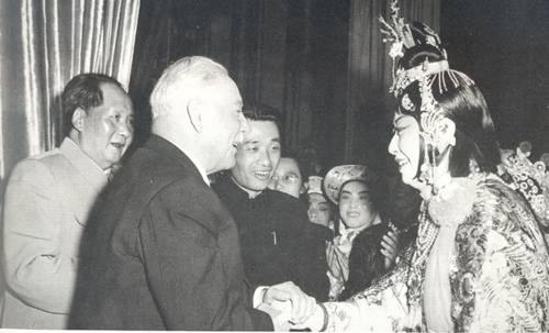 ????1959年10月,毛澤東在京觀看了梅蘭芳向國慶10周年獻(xiàn)演的新編歷史劇《穆桂英掛帥》。這是梅蘭芳解放后參與編演的(包括唱腔設(shè)計(jì))惟一新劇目。