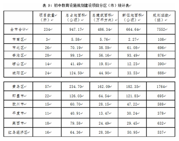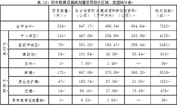 全市規(guī)劃初中教育設(shè)施 387 所(含九年一貫制學(xué)校 28 所),共計(jì) 12424 個(gè)班。其中現(xiàn)狀保留初中 153 所,計(jì) 4872 個(gè)班;規(guī)劃建設(shè)初中 234 所(含新建 172 所,原址改擴(kuò)建 47 所,遷建 14所,原有教育設(shè)施置換 1 所),計(jì) 7552 個(gè)班。規(guī)劃建設(shè)初中學(xué)??傆玫孛娣e 947 公頃,預(yù)計(jì)新征地面積 665 公頃,建筑面積486 萬平方米。