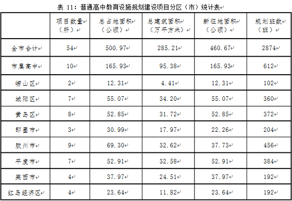 按照各區(qū)(市)規(guī)劃人口規(guī)模對普通高中的學(xué)位需求量,在嶗山區(qū)、城陽區(qū)、黃島區(qū)、紅島經(jīng)濟區(qū)和各縣級市規(guī)劃建設(shè)普通高中 44 所,其中新建 38 所、原址改擴建 3 所、遷建 2 所、原有教育設(shè)施置換 1 所。