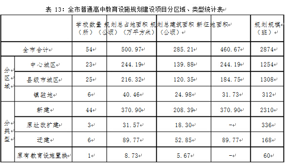 ?全市規(guī)劃普通高中教育設(shè)施(含完全中學(xué)) 95 所,共計 5084個班。其中現(xiàn)狀保留普通高中 41 所,計 2210 個班;規(guī)劃建設(shè)普通高中 54 所(含新建 44 所,原址改擴建 3 所,遷建 6 所,原有教育設(shè)施置換 1 所),計 2874 個班。規(guī)劃建設(shè)普通高中總用地面積 501 公頃,預(yù)計新征地面積約 461 公頃,總建筑面積285 萬平方米。