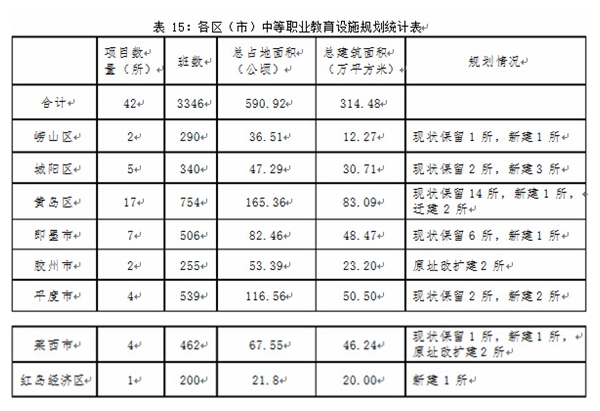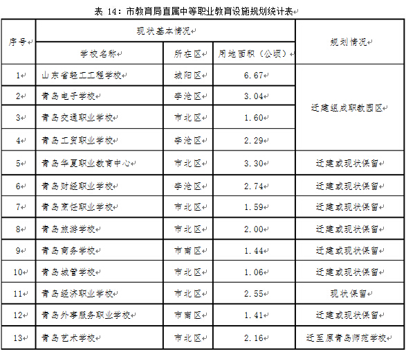 全市規(guī)劃中等職業(yè)學校 81 所,其中現(xiàn)狀保留市教育局所屬中等職業(yè)學校 1 所,遷建 4 所,原有教育設施置換 1 所,遷建或現(xiàn)狀保留 7 所;現(xiàn)狀保留市屬行業(yè)企業(yè)辦、民辦中等職業(yè)學校和技工學校 23 所,遷建 3 所(青島市機械技術學校、青島市橡膠技術學校、青島市冶金技術學校);各區(qū)(市)現(xiàn)狀保留中等職業(yè)學校 26 所,規(guī)劃建設 16 所(新建 10 所,原址改擴建 4所,遷建 2 所)。2016 年前建成規(guī)劃占地 61 公頃的青島(上馬)職教園區(qū),依托山東省輕工工程學校,整合青島電子學校、青島交通職業(yè)學校、青島工貿(mào)職業(yè)學校等教育資源,形成以機械制造業(yè)和電子產(chǎn)業(yè)為主,由 1 所高職學校、3 所中職學校及公共配套設施組成的職教園區(qū)。將青島藝術學校遷至原青島師范學校校址,用地面積5.73 公頃。2020 年前在市區(qū)東部建設 1-2 所以金融、旅游或烹飪專業(yè)為主的職業(yè)院校,在西海岸新區(qū)或膠州市建設 1 所物流專業(yè)為主的職業(yè)院校。在王哥莊片區(qū)規(guī)劃建設職教園區(qū)。