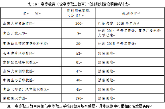 ?2016 年完成山東大學(xué)青島校區(qū)一期建設(shè)項目;在藍色硅谷片區(qū)規(guī)劃建設(shè)青島財富管理學(xué)院;在王哥莊片區(qū)規(guī)劃建設(shè)青島高等護理學(xué)院;與德國應(yīng)用技術(shù)大學(xué)聯(lián)盟等聯(lián)合組建多個學(xué)科領(lǐng)域的“教授工作室”,籌建中德合作大學(xué)。在青島幼兒師范學(xué)校基礎(chǔ)上,采取異地建設(shè)方式,建設(shè)青島幼兒師范高等??茖W(xué)校(占地 30 公頃);在青島廣播電視大學(xué)基礎(chǔ)上,異地建設(shè)青島開放大學(xué),推進高等教育與社區(qū)教育聯(lián)合互動,帶動社區(qū)教育發(fā)展。在膠南組團規(guī)劃預(yù)留約 190 公頃高校發(fā)展用地。
