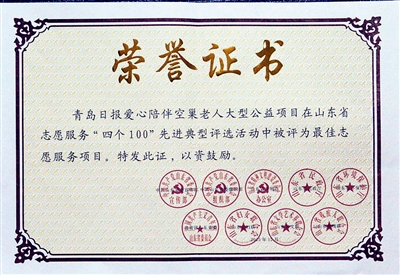 1月25日,從省有關(guān)部門傳來喜訊:鑒于本報(bào)“愛心陪伴空巢老人”大型公益活動(dòng)在傳播文明、服務(wù)社會(huì)、促進(jìn)和諧等方面發(fā)揮的巨大引導(dǎo)作用和積極的示范效應(yīng),本報(bào)“愛心陪伴”繼獲得2015年“山東省德耀齊魯?shù)赖率痉痘亍敝?,再次獲得省委宣傳部、省委組織部等9個(gè)部門的肯定,被評(píng)為山東省最佳志愿服務(wù)項(xiàng)目。