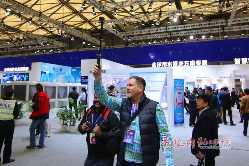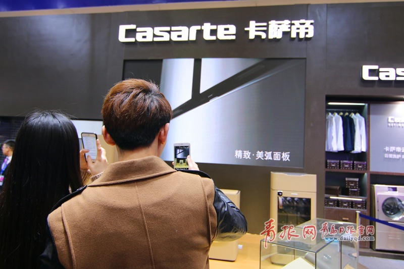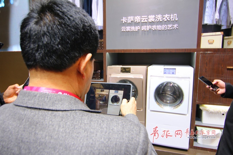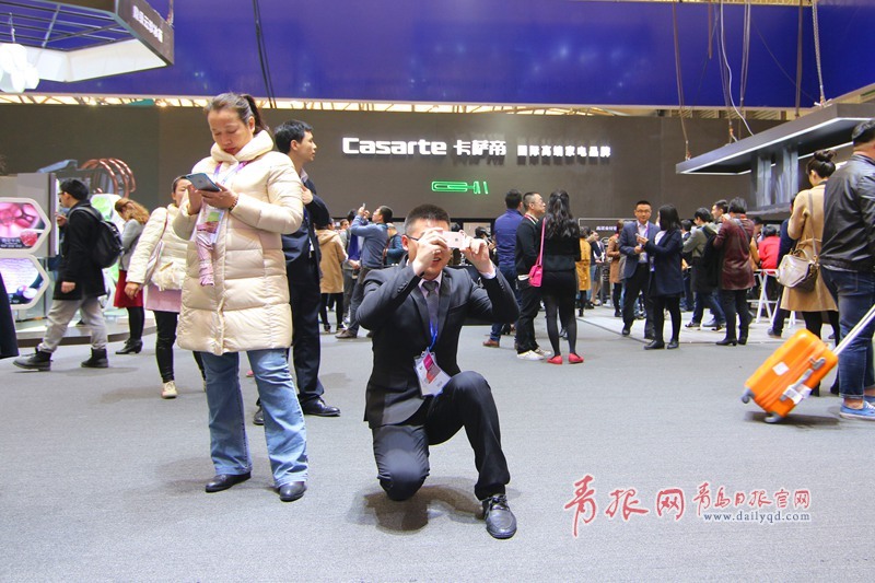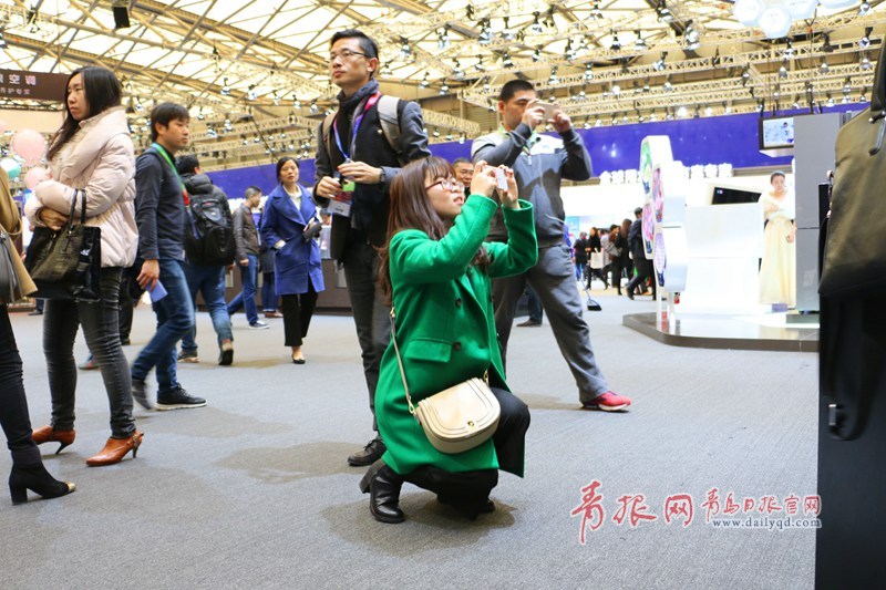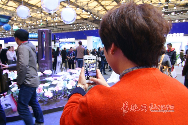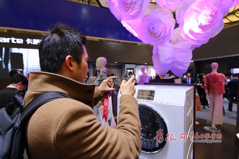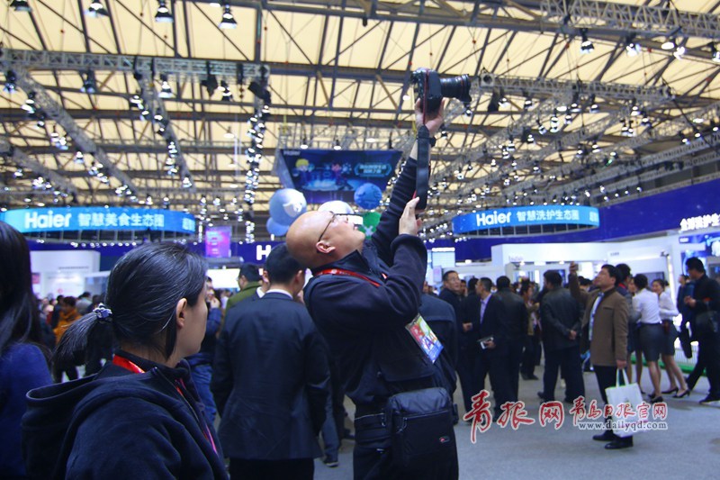 青島日?qǐng)?bào)/青報(bào)網(wǎng)訊 3月9日上午,2016中國(guó)家電博覽會(huì)海爾四千平米的展區(qū)人氣爆棚,智能物聯(lián)的馨廚冰箱、干濕分離的保鮮儲(chǔ)存技術(shù)、智能自清潔的空調(diào)、子母雙桶洗衣機(jī)等都引得觀眾駐足體驗(yàn)智慧家居的魅力,眾多產(chǎn)品引發(fā)現(xiàn)場(chǎng)參觀者開啟瘋狂拍拍拍模式。圖為參觀者給機(jī)器人拍照。(楊曉琛 攝影)