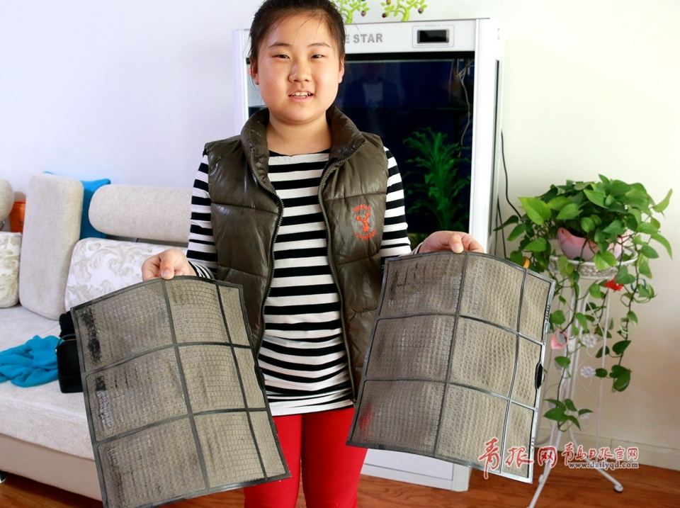 孫女士的女兒拿著剛?cè)∠碌倪^濾網(wǎng)。青島日報/青報網(wǎng)記者 張麗潔攝