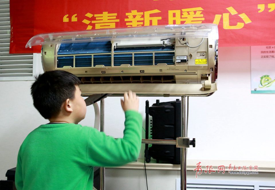 被“會洗澡”的空調(diào)吸引的小帥哥。青島日報/青報網(wǎng)記者 張麗潔攝