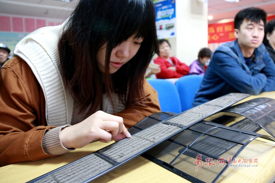 美女為大家驗(yàn)證過濾網(wǎng)清洗前后效果。青島日報(bào)/青報(bào)網(wǎng)記者 張麗潔