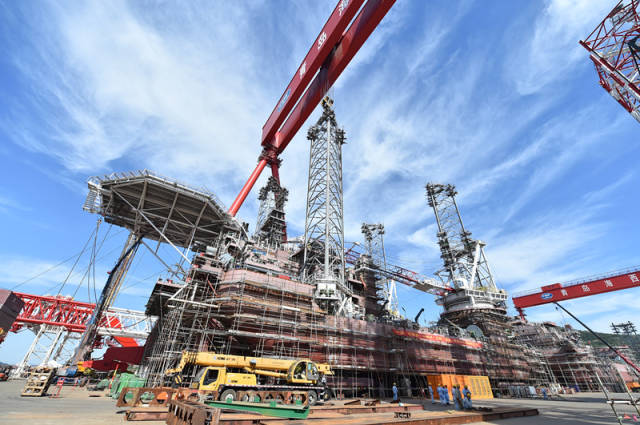 如同“樓房”一般的自升式海工平臺是海上輔助作業(yè)平臺,配載3000噸,可供250人同時在上面住宿,而且可以電力推進及升降。