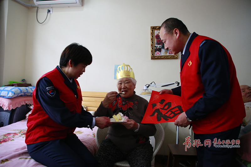 現(xiàn)場共有35位空巢老人和30位志愿者共享慶生的歡樂,有幾位“老壽星”因身體原因無法參加慶生會(huì),志愿者們特意帶著福字和切好的蛋糕,到房間里悉心探望,一一送上生日祝福。