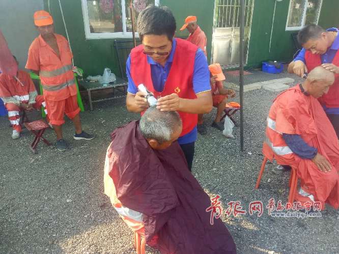 > 正文青島日?qǐng)?bào)/青島觀/青報(bào)網(wǎng)訊 8月7日,室外溫度33℃,真情巴士一路情志愿團(tuán)隊(duì)的王立彥、張華軍、孫嘉良、王凱一行4人來到了西海岸辛安街道環(huán)衛(wèi)工人之家,為這里的環(huán)衛(wèi)工人理發(fā)。