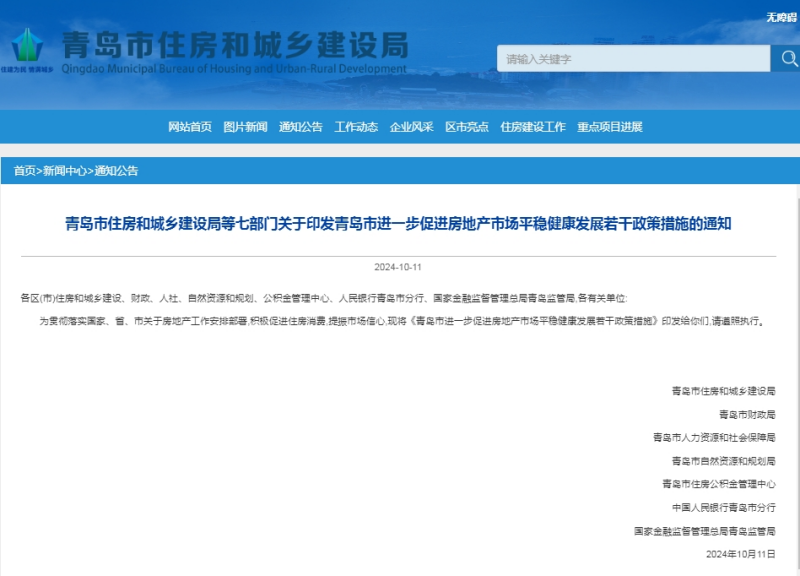 ?????? 剛剛,青島市住房和城鄉(xiāng)建設局官網(wǎng)發(fā)布《青島市住房和城鄉(xiāng)建設局等七部門關于印發(fā)青島市進一步促進房地產(chǎn)市場平穩(wěn)健康發(fā)展若干政策措施的通知》。