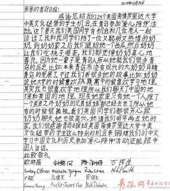 ????11月14日,美國(guó)南佛羅里達(dá)大學(xué)24名學(xué)生一起致信本報(bào)編輯部,“我們很感謝青島日?qǐng)?bào)能給我們美國(guó)學(xué)生機(jī)會(huì),在青島參加愛(ài)心陪伴活動(dòng)?!痹谛胖?,這些美國(guó)學(xué)生深情的回顧了自去年參加愛(ài)心陪伴活動(dòng)的點(diǎn)點(diǎn)滴滴,講述了他們和中山路街道4位空巢老人之間的情感交集,字里行間不難看出學(xué)生們對(duì)愛(ài)心陪伴對(duì)象之一相云老人的關(guān)切:“我們陪了一位熱情善良的奶奶……但現(xiàn)在家里只有奶奶一個(gè)人,她肯定孤獨(dú)……”