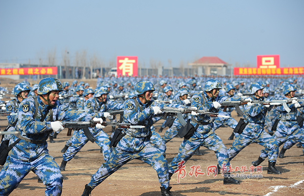 ????青島日報(bào)/青報(bào)網(wǎng)訊 12月8日上午,北海艦隊(duì)在某訓(xùn)練基地靶場舉行2014年新兵入伍訓(xùn)練結(jié)業(yè)典禮,20個方隊(duì)的2000余名新兵接受濟(jì)南軍區(qū)副司令員兼北海艦隊(duì)司令員袁譽(yù)柏檢閱,10個方隊(duì)士氣高昂分科目展示實(shí)戰(zhàn)化訓(xùn)練成果。