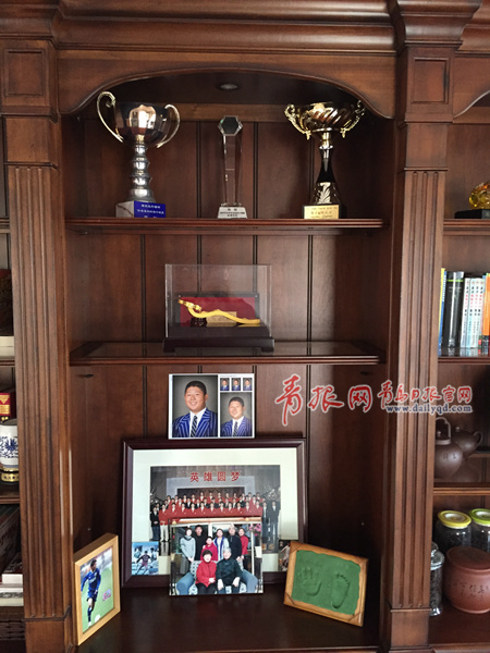 陳剛在家中專門辟出一塊地來擺放自己踢球時所獲得的獎杯