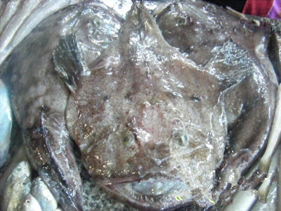 黃鮟鱇,俗稱老板魚、哈蟆魚,肉質很嫩,胃和肝也是美味,胃有專門作為魚肚出售,肝可蒸制后食用第一次的見的時候真心嚇一跳,伙計,你長成這個樣帶嚇死個誰?但是吃起來口感Q彈細膩,真心很鮮美,身上沒小硬刺。推薦吃飯:紅燒,點蒜瓣,味更香。