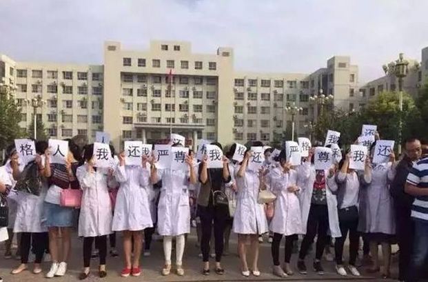 9月28日上午,太康縣人民醫(yī)院的醫(yī)護(hù)人員聚集到大街上,舉著“還我尊嚴(yán)、還我人格”的牌子??棺h這次圍攻侮辱醫(yī)護(hù)人員的事件。