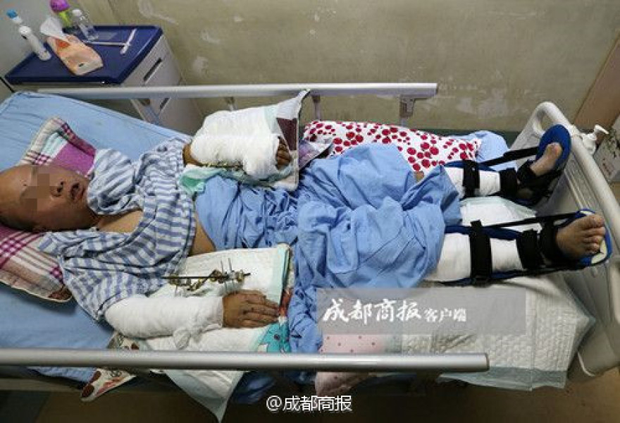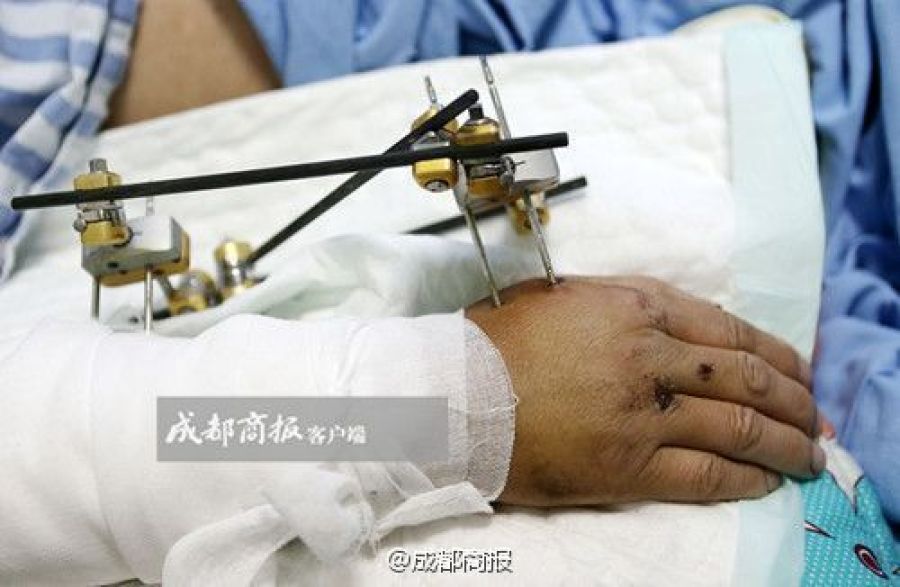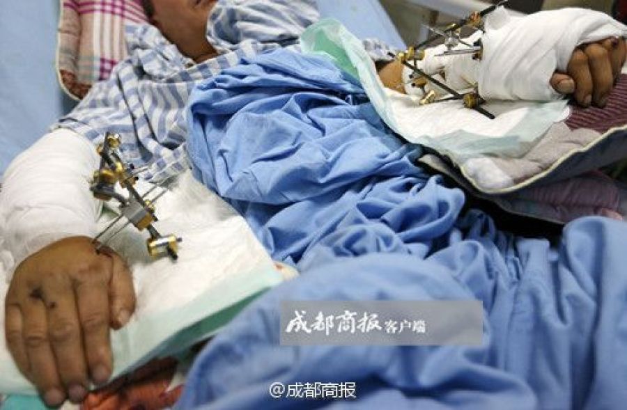 當(dāng)同事們遇見韋華時,他已經(jīng)躺在了擔(dān)架上,眼睛無力地睜著。帽子和眼鏡都不見了,一根折斷的指骨顯露在外面,四肢血肉一片模糊,兩只褲腿被血浸成了深紅?!绊f華失血太多了,在那兒先做了急救處理,輸血,前前后后輸了4000CC?!碑?dāng)醫(yī)生剪開他的褲腿和袖子的時候,發(fā)現(xiàn)他的腳筋已被咬斷,四肢的肌肉都被嚴重咬爛了。進一步檢查發(fā)現(xiàn),他雙手的腕骨都被咬斷了,左手掌約三分之一幾乎被咬掉。他將面臨漫長的康復(fù)過程。