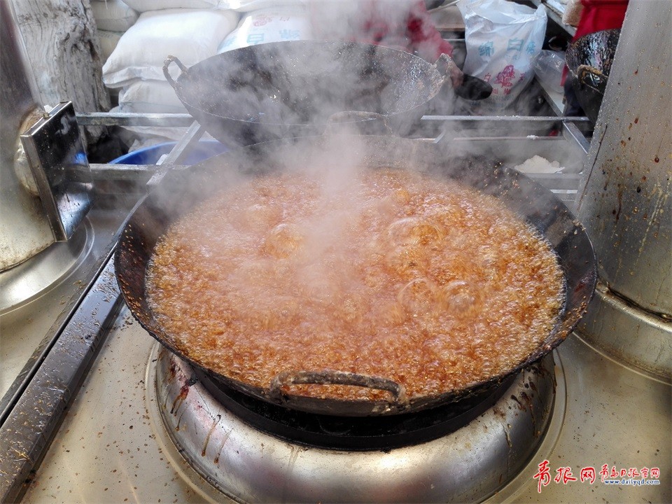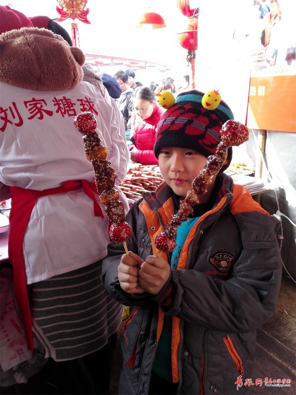小朋友手里拿著紅燒肉糖球。劉家糖球被稱為“花樣糖球王”,每每都在創(chuàng)新糖球樣式上走在前面?!敖衲晡覀冃鲁隽思t燒肉糖球、烤地瓜糖球等幾個(gè)品種?!眲⒓姨乔蚪?jīng)營者劉群芳告訴記者。新品紅燒肉糖球看上去跟烤肉串相似,除兩端是兩顆山楂外,中間滿是一塊塊亮晶晶的紅燒肉。吃上一口,嘴里糖稀的甜味跟紅燒肉的香味相混合,別有一番風(fēng)味。雖然這種糖球一串要20元,但樣式新奇,購買的市民仍然絡(luò)繹不絕。