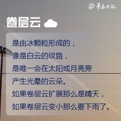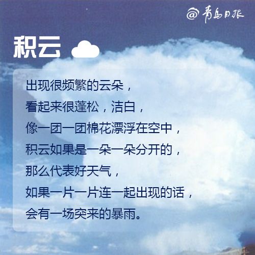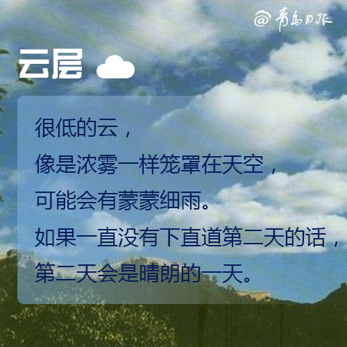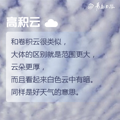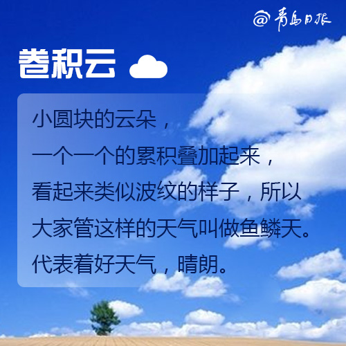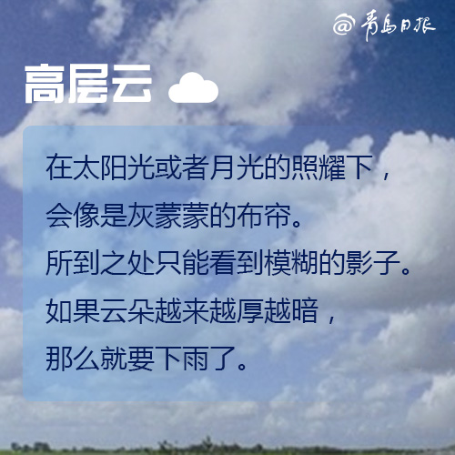 春夏秋冬,陰晴雨雪,風(fēng)云變幻,氣象萬千。天氣與人類生活息息相關(guān),而天氣的變化自有它的征兆?,F(xiàn)在,請你把目光投向天空,看看那飄浮的云彩,這大自然的文字,這天氣的“招牌”該怎么解讀呢?且看青報君為您詳解。