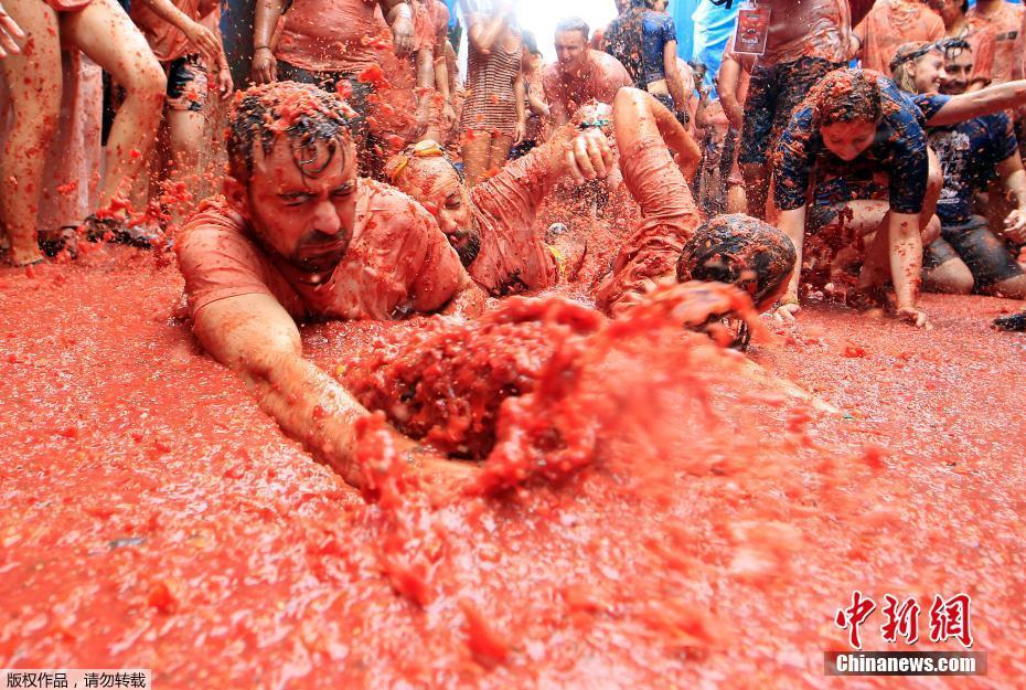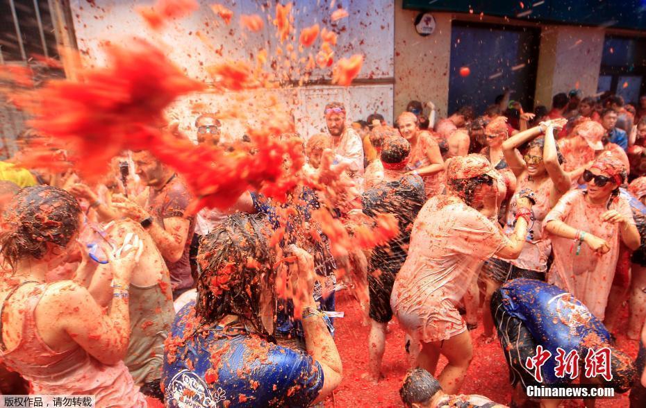 當?shù)貢r間8月30日,西班牙巴倫西亞布尼奧爾鎮(zhèn)舉辦一年一度的番茄大戰(zhàn),數(shù)萬民眾相互扔番茄狂歡。每年八月的最后一個星期三,成千人聚集在西班牙小鎮(zhèn)布尼奧爾,參加全球知名的“Tomatina”番茄大戰(zhàn),消耗約160噸番茄。今年有2.2萬人參加了這一盛大的活動。