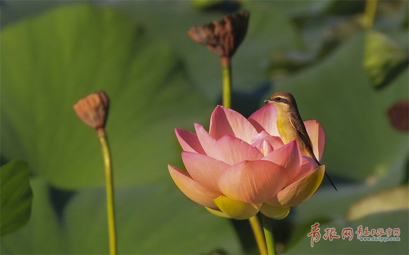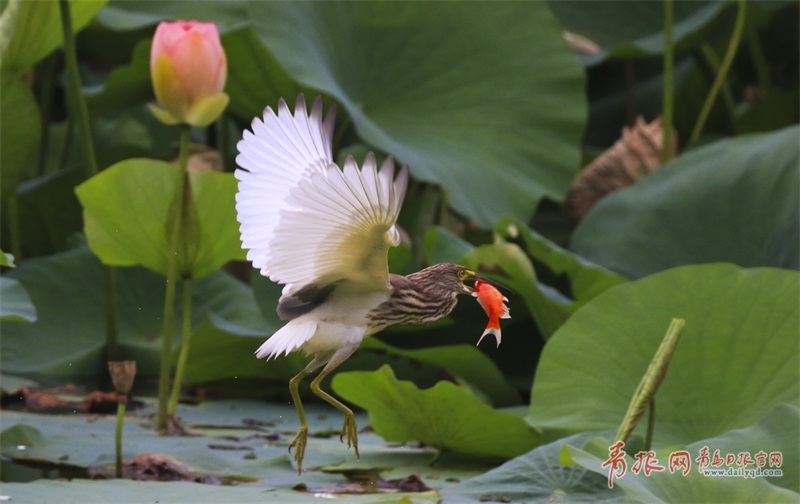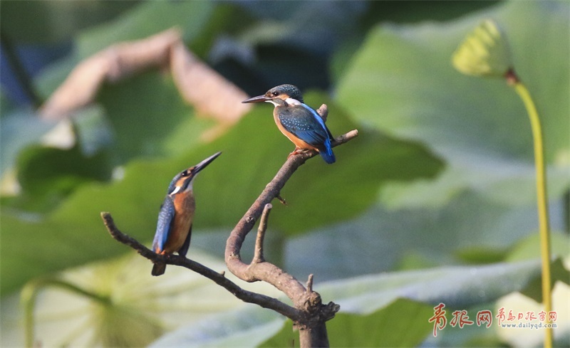 初秋時節(jié),中山公園小西湖變身水鳥樂園。白鷺、池鷺、白腰文鳥、翠鳥、伯勞、黑水雞和黃偉鳽等候鳥們紛紛現(xiàn)身,他們在荷花間嬉戲追逐,撲食練飛,一派生機勃勃的景象。(“青島觀”攝影師 崔超攝)