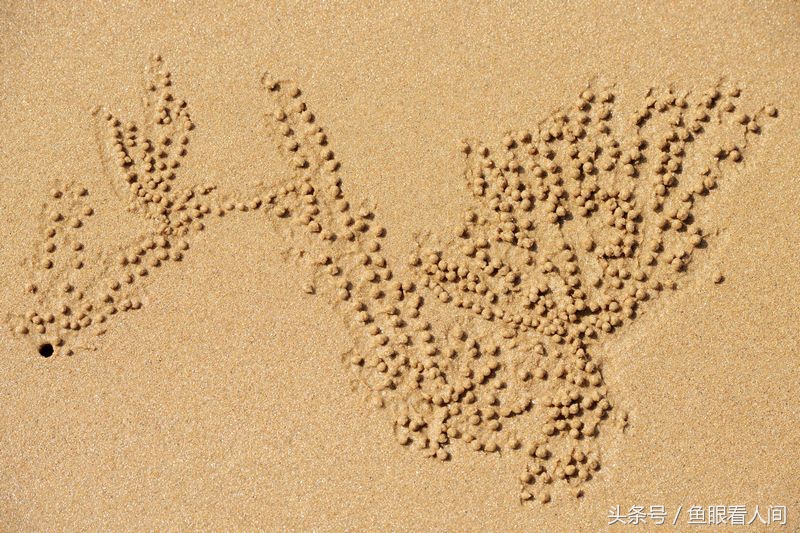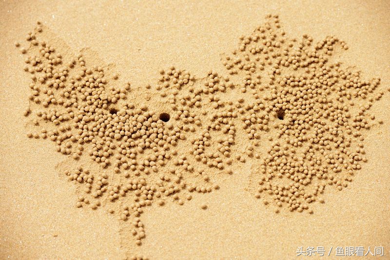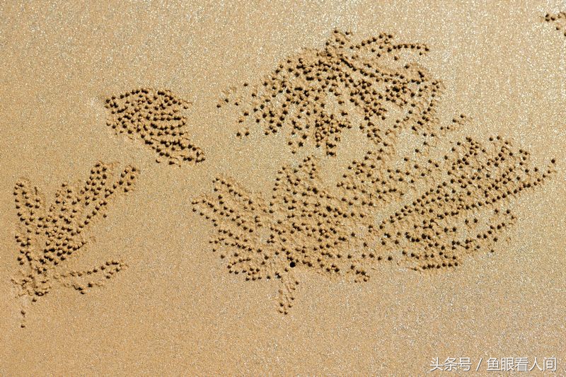 沙灘蟹推出的小球一般呈扇形分布,看上去像一只只鳳凰,或者像某個(gè)地區(qū)的地圖,也有些是抽象派的,發(fā)揮你的想象力來欣賞。
