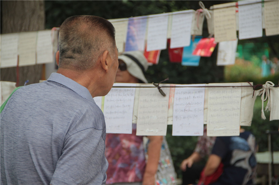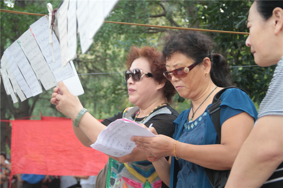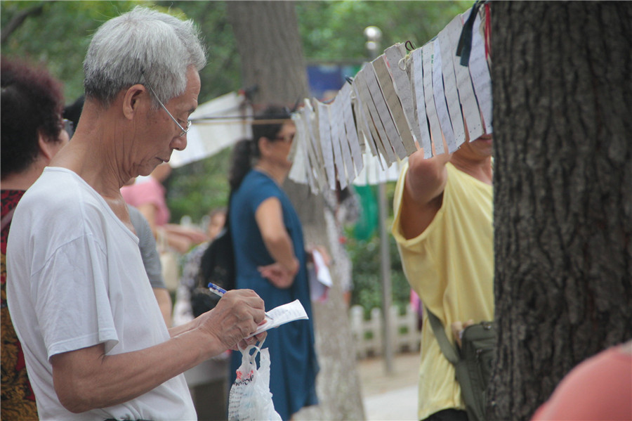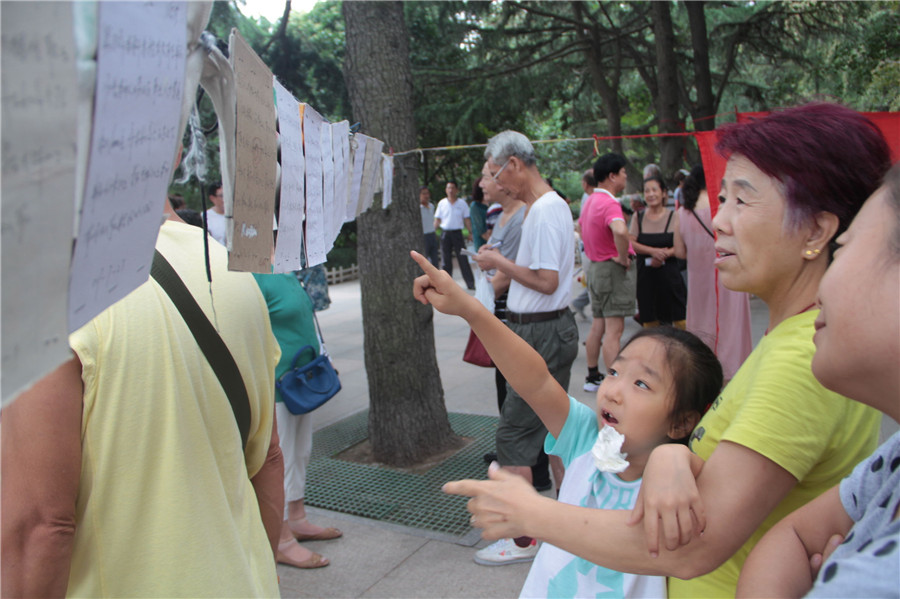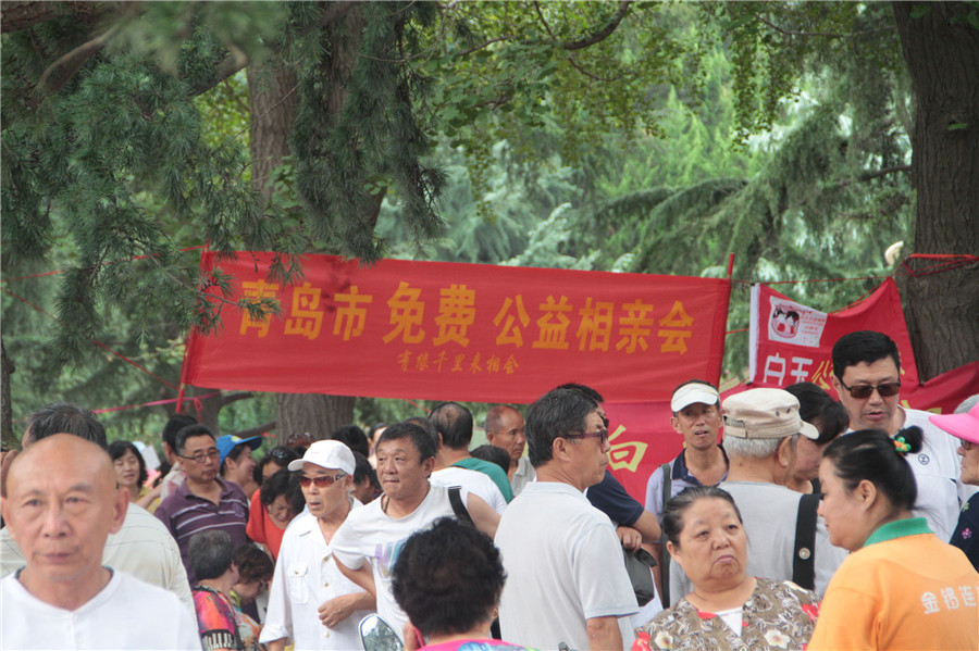 在青島市海泊河公園內(nèi)有這樣一處免費相親角,每到周六的時候,都會有數(shù)百名大媽大爺們自發(fā)前來替自己的兒女相親,也有很多人制作了卡片掛在相親角落里,上面標明了子女的基本信息。 張富紅 攝