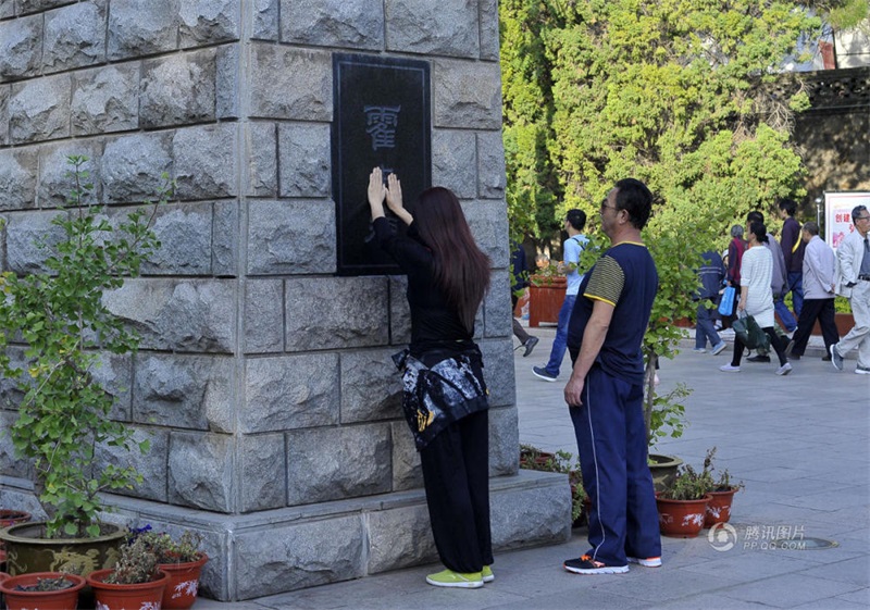 記者注意到,從山門到霍去病雕像之間的距離不到一百米。如今,雕像下面刻有“霍去病”三個字的黑色大理石已經(jīng)被摸得很光滑,記者在現(xiàn)場的四十分鐘里,有200多人觸摸過“霍去病”三個字。