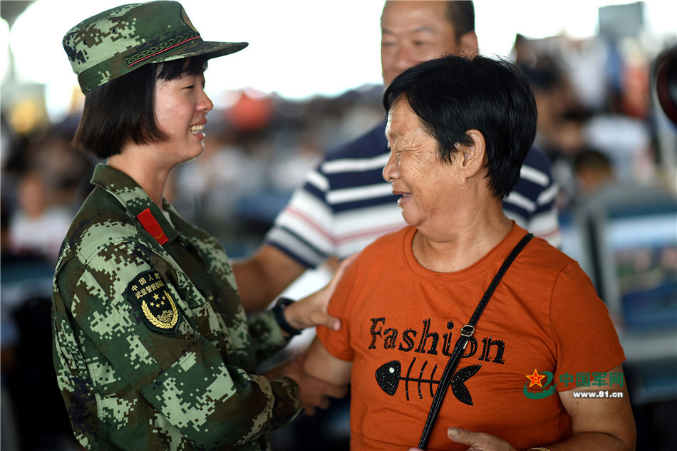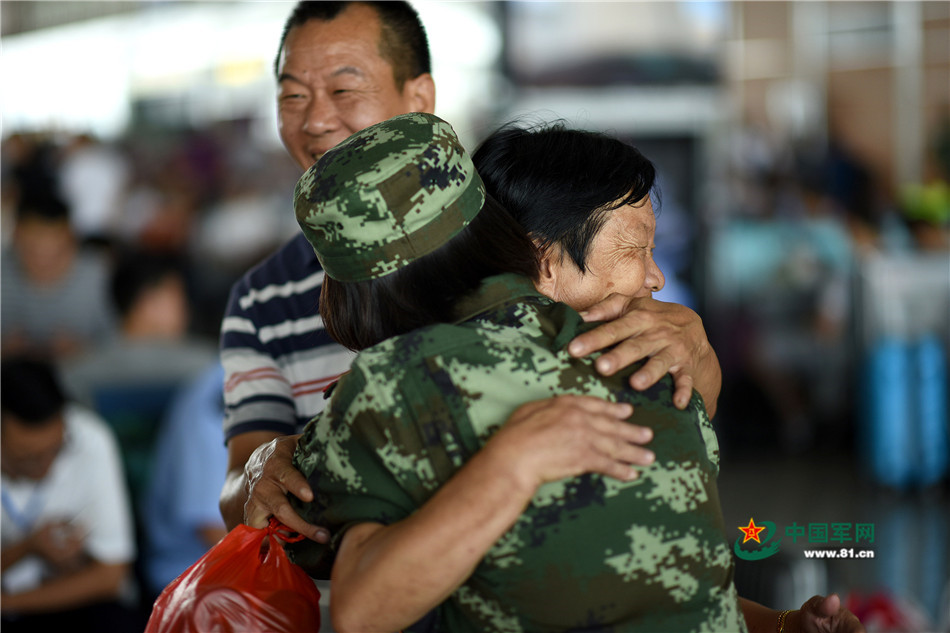“奶奶!”一名女兵站了起來,向一名老人擁抱上去,隨即眼淚奪眶而出。但女兵很快就止住了,她與老人說了幾句話,趕緊跑到隊列排頭向隊長請了假,再跑向老人,把老人帶到一旁的休息區(qū)。隊長郝然上尉介紹,女兵叫李雅芳,家在附近,家人知道她今天要搭乘高鐵,所以從小就特別特疼愛她的奶奶在爸爸的陪同下專程來高鐵站碰碰運氣,看能不能見著小孫女。