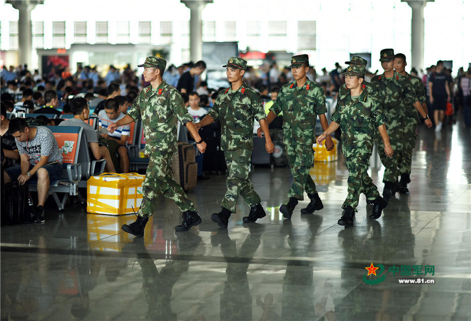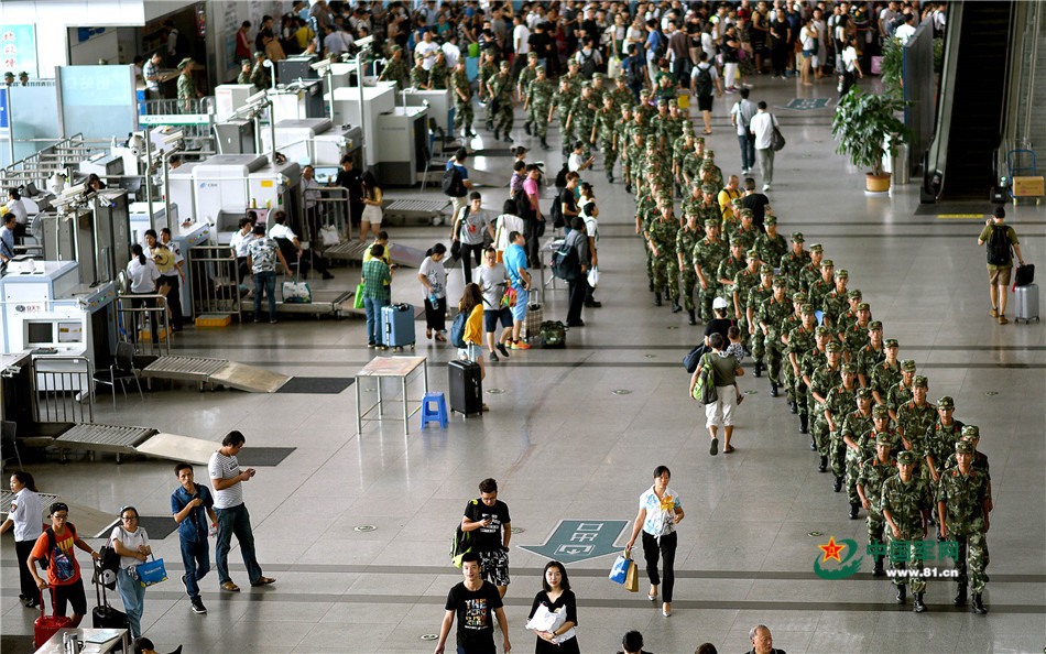 官兵在候車區(qū)內(nèi)整齊集結(jié)候車。