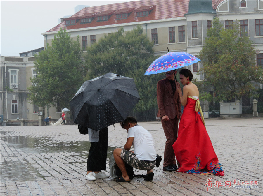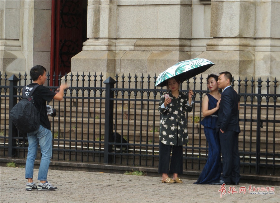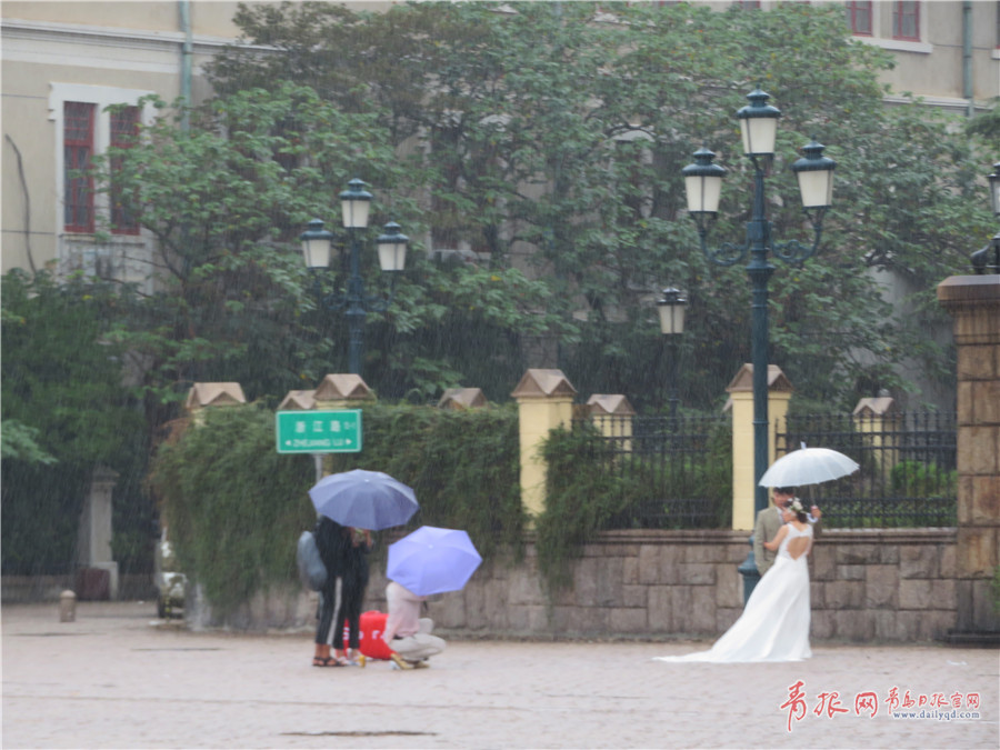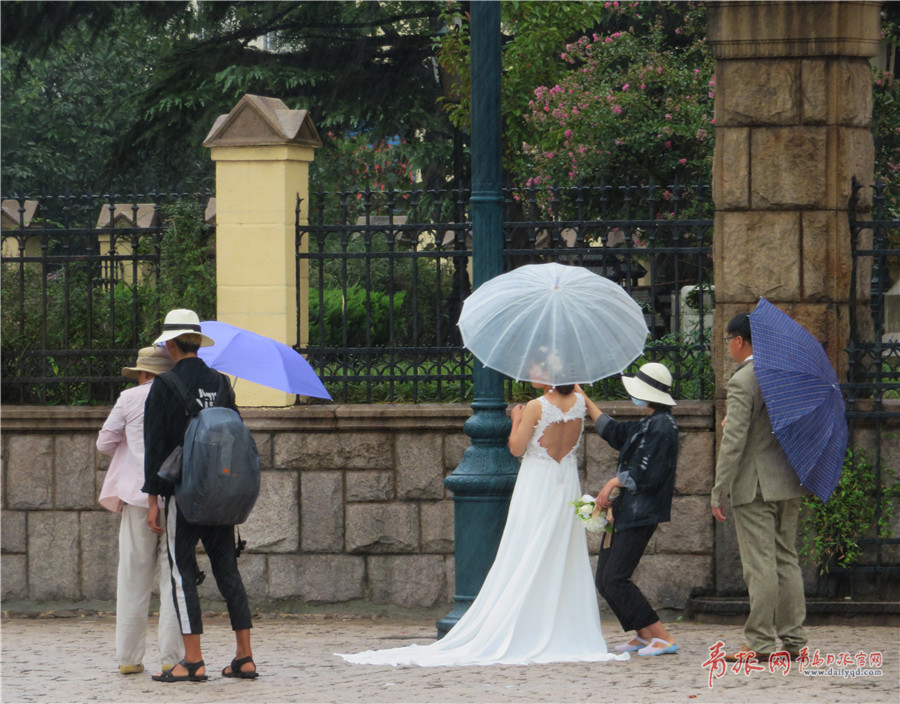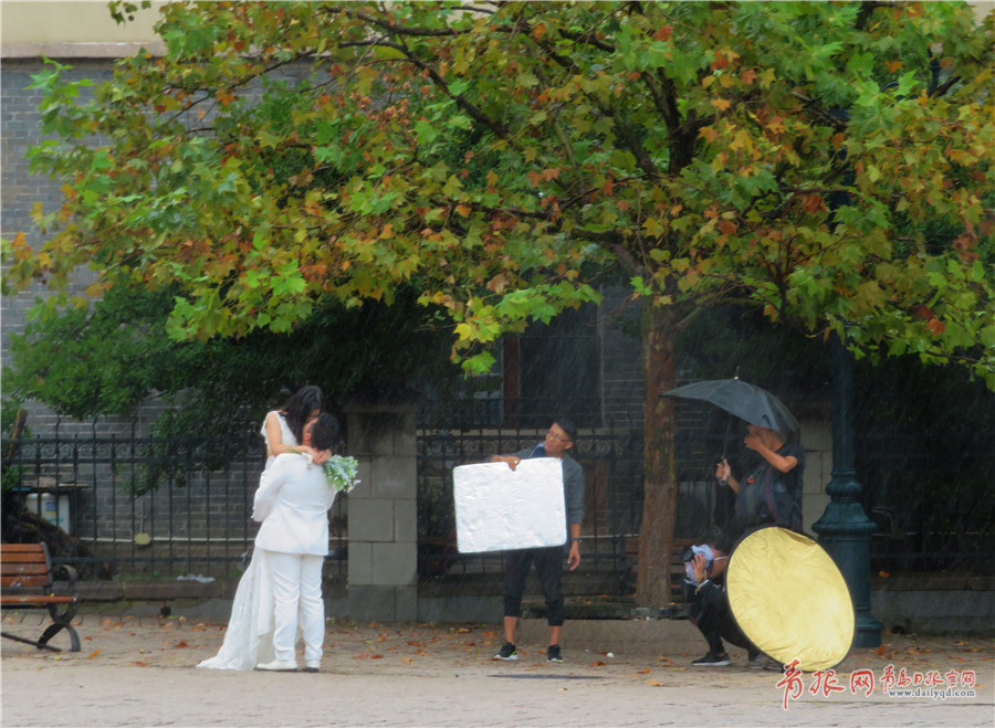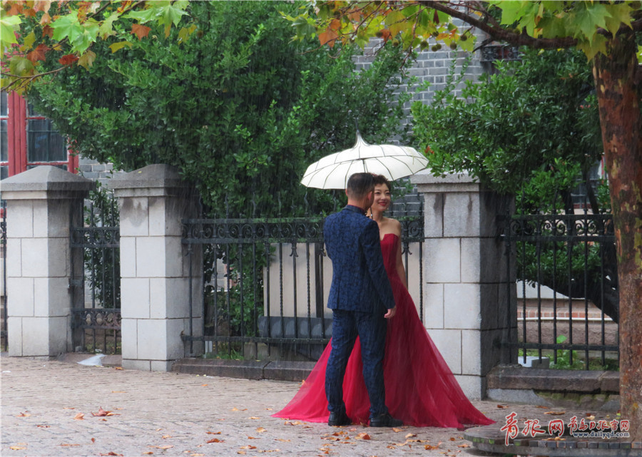 從昨天夜晚開始,一場(chǎng)紛紛揚(yáng)揚(yáng)的秋雨漫灑蒼穹。盡管帶來(lái)了濃濃的秋意和怡人的秋景,然而對(duì)于早已排好日程拍婚紗照的新人們來(lái)說(shuō),這場(chǎng)秋雨卻是“不速之客”。在浙江路教堂前,就有很多冒雨拍婚紗照的新人。雖然有諸多不便之處,不過(guò)秋雨也為拍攝增添了一些別樣的意境。