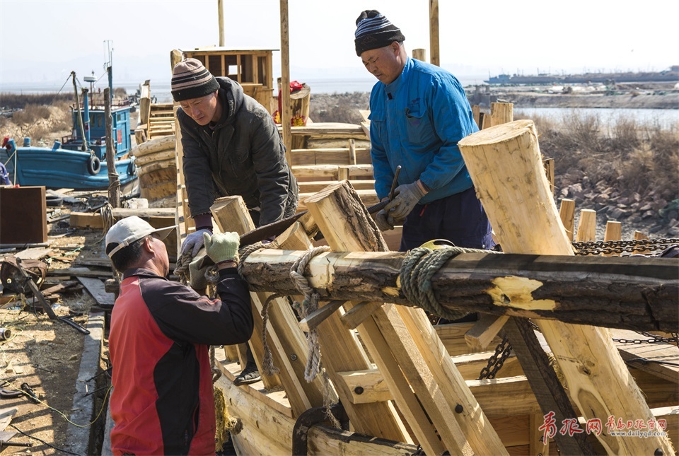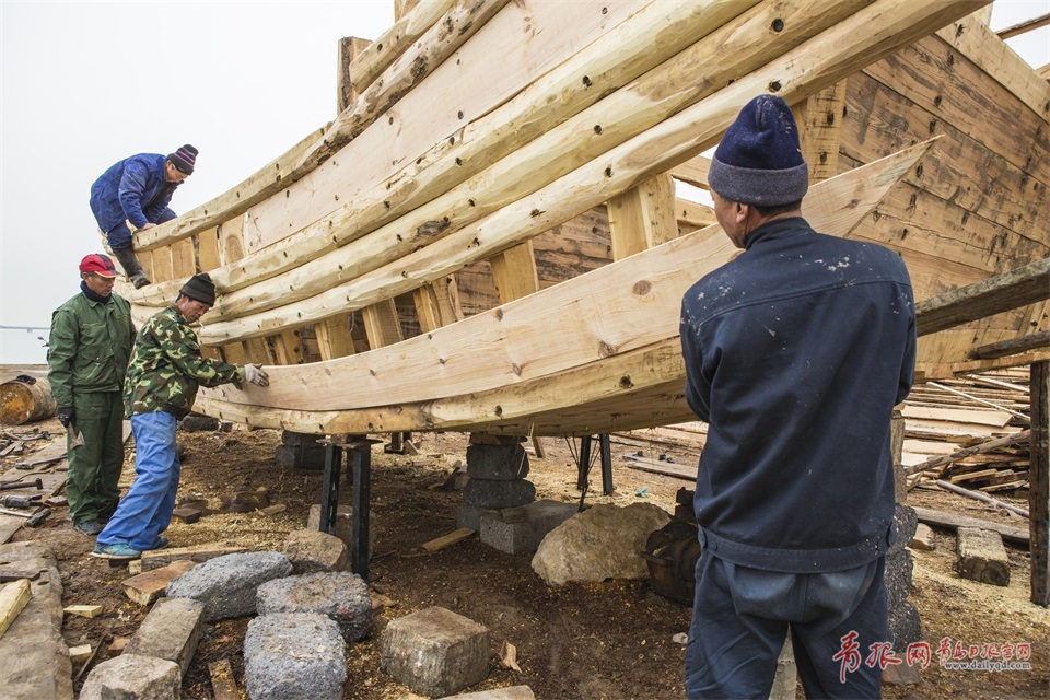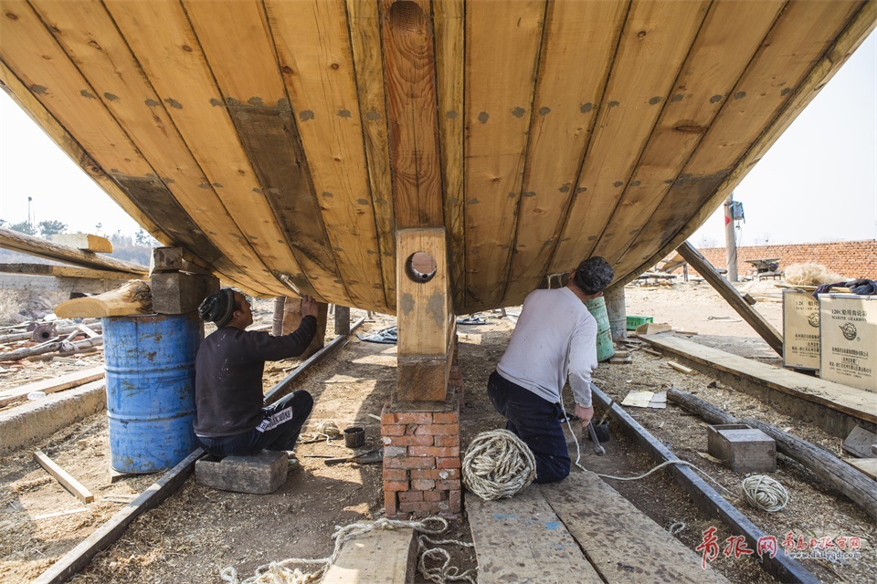 百余年來,這手工造船的技藝和嚴(yán)謹(jǐn)?shù)膽B(tài)度,依靠著祖輩們口傳心授,沿襲至今。圖為安裝船骨架。
